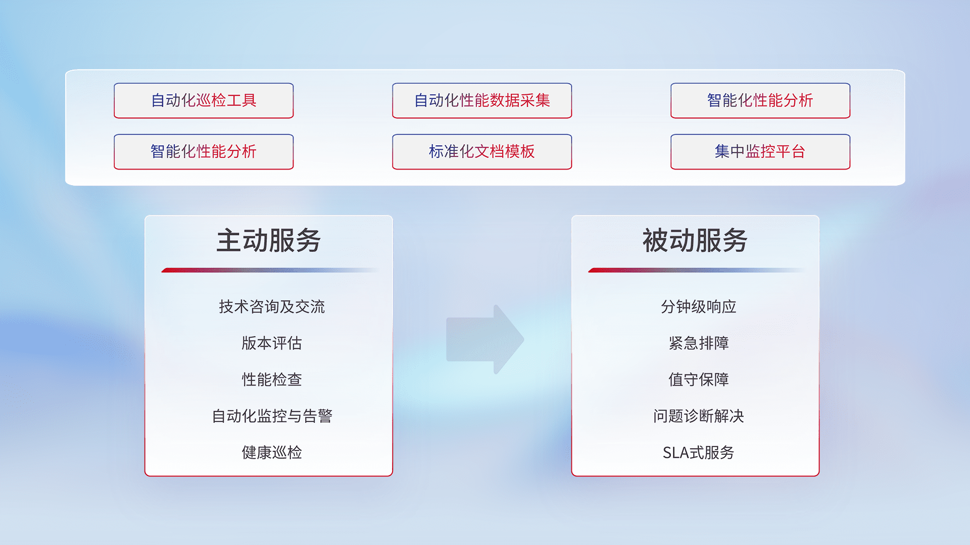 智能化工具和标准化文档,,,,保障服务质量,,提供主动服务(包含技术咨询、、、、版本评估、、、性能检查、、、自动化监控与告警、、健康巡检)和被动服务包含(分钟级响应、、、紧急排障、、、值守保障、、、问题诊断解决、、SLA服务)。。。